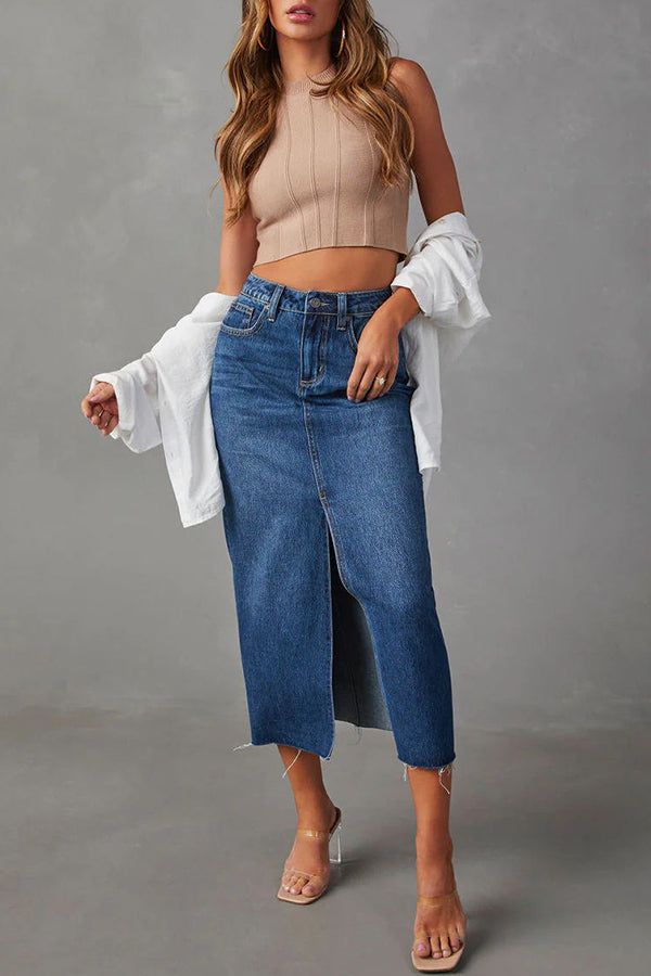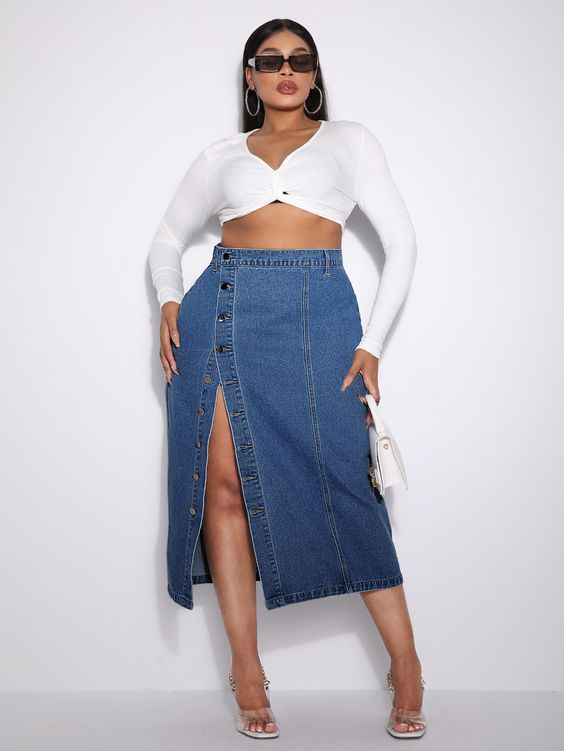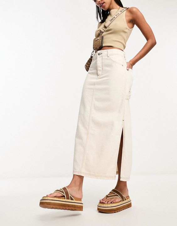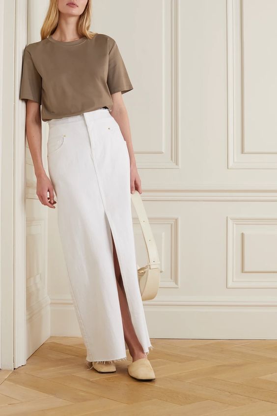 The denim maxi skirt is for the woman who writes her own rules. The one pictured here sports a daring slit, hinting at the freedom and rebellious spirit of summer. Combined with a white crop top, it’s an outfit that’s both casual and seductive. The long denim skirt is a canvas for personal expression, whether it’s with minimalist sandals or statement jewelry.