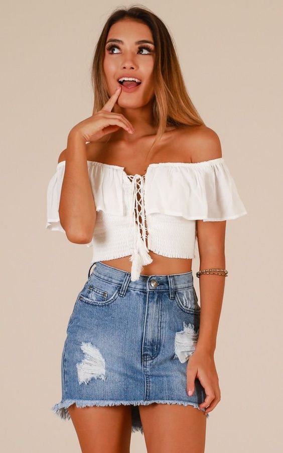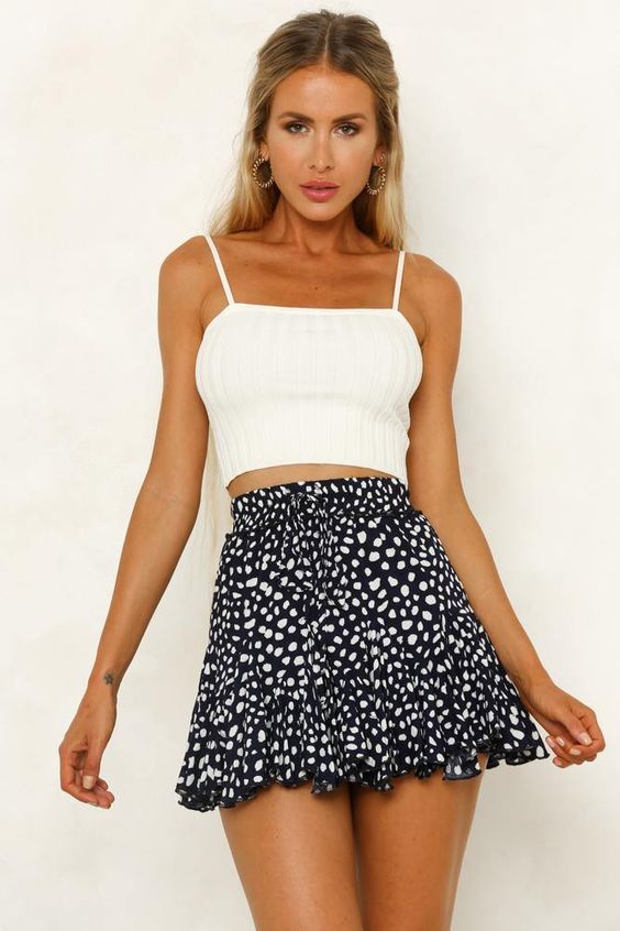 Nothing says summer like a denim skirt, and in 2024, the mini is back with a vengeance. It’s the epitome of cute and practical, perfect for a day at the park or a casual coffee date. The woman here is a vision of modern simplicity, her fitted white tank top accentuating the casual short denim skirt. It’s a look that pays homage to the past while staying firmly planted in the present, proving that some styles truly are timeless.