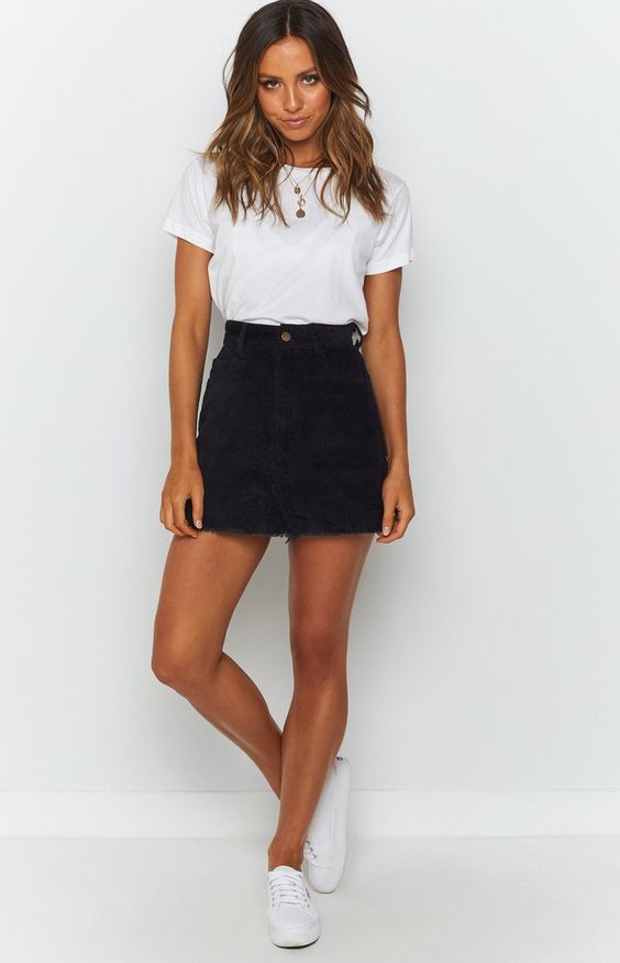 The black mini skirt has always been a versatile piece, and this graphite-toned iteration is no exception. The young woman’s ensemble is a masterclass in casual yet aesthetic dressing. She pairs her skirt with a cropped graphic tee, creating a playful contrast between edgy and approachable. This outfit is perfect for anyone looking to add a splash of youthfulness to their wardrobe without sacrificing sophistication.