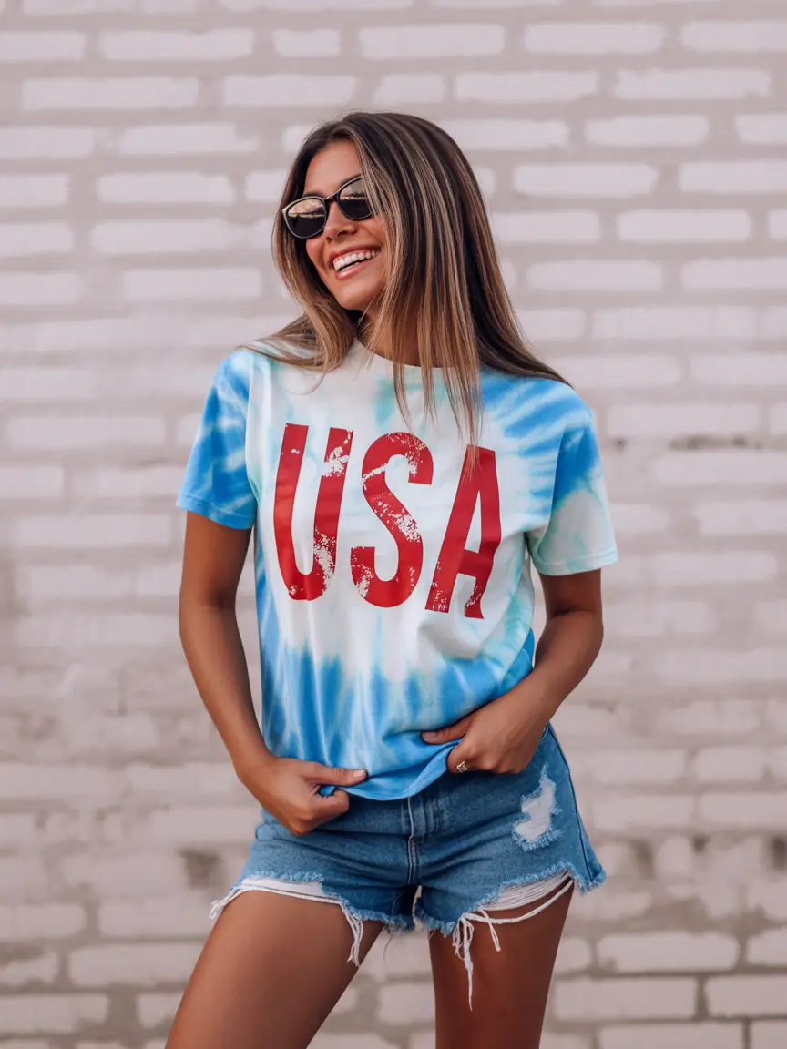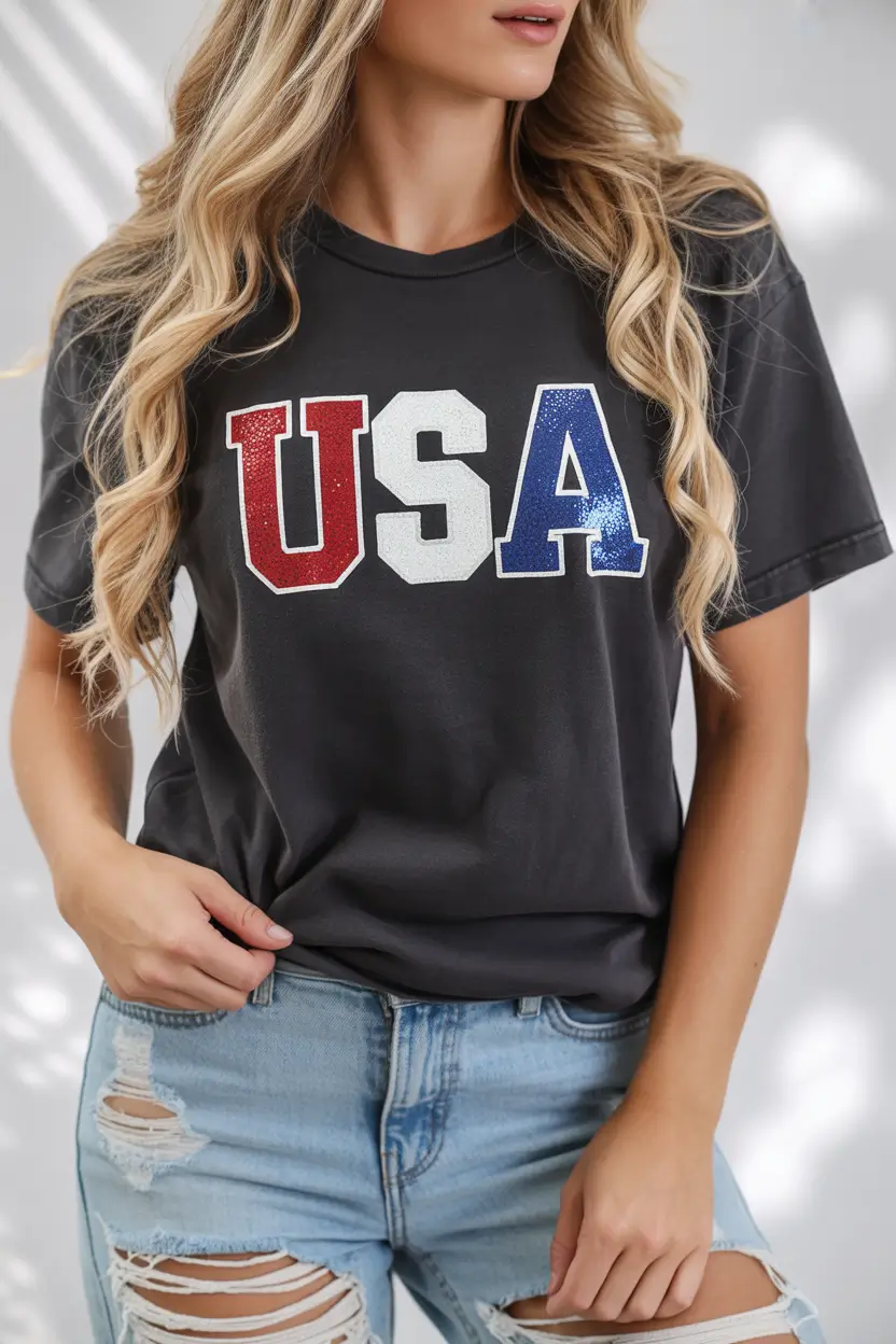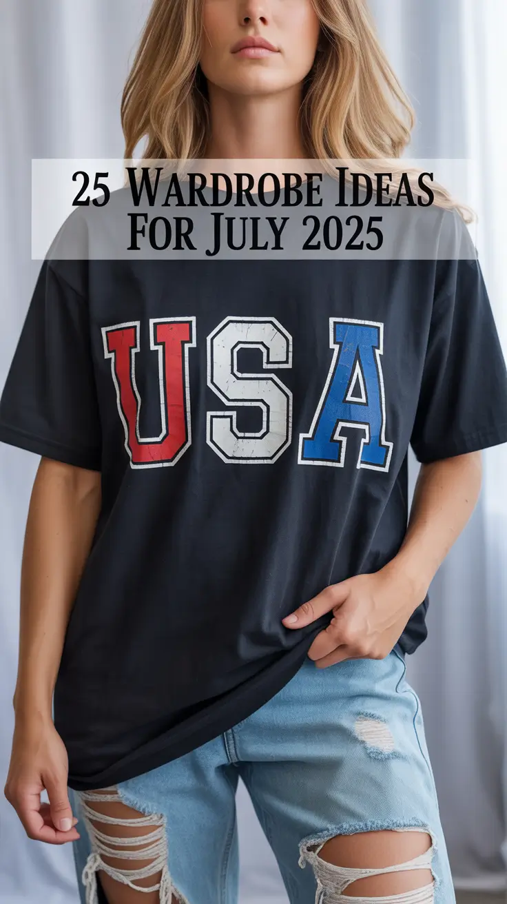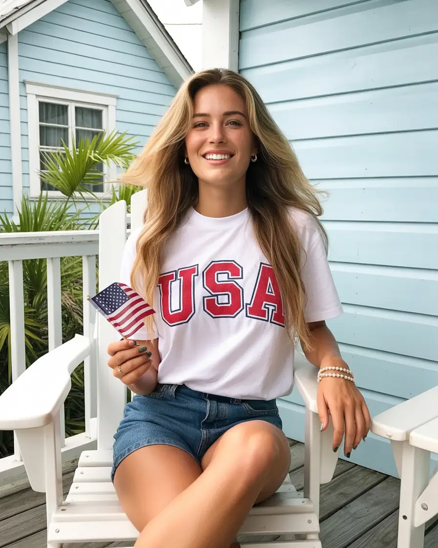 Nothing is better for July 2025 than a white tee with strong red “USA” lettering and high-waisted denim shorts. The style gives off a fresh and confident feel, and it’s easy to see how patriotic it is. With a mini flag in your hand and a sunlit porch as your background, this outfit clearly shows you’re ready for summer, whether you have plans at home or outside.