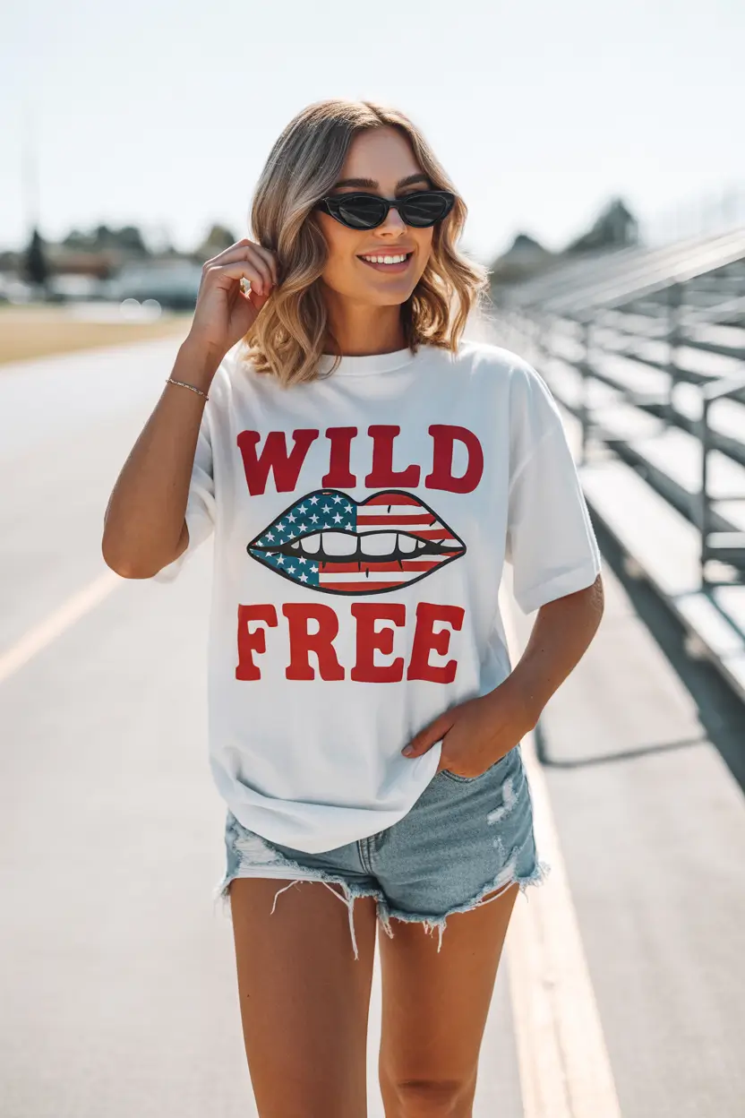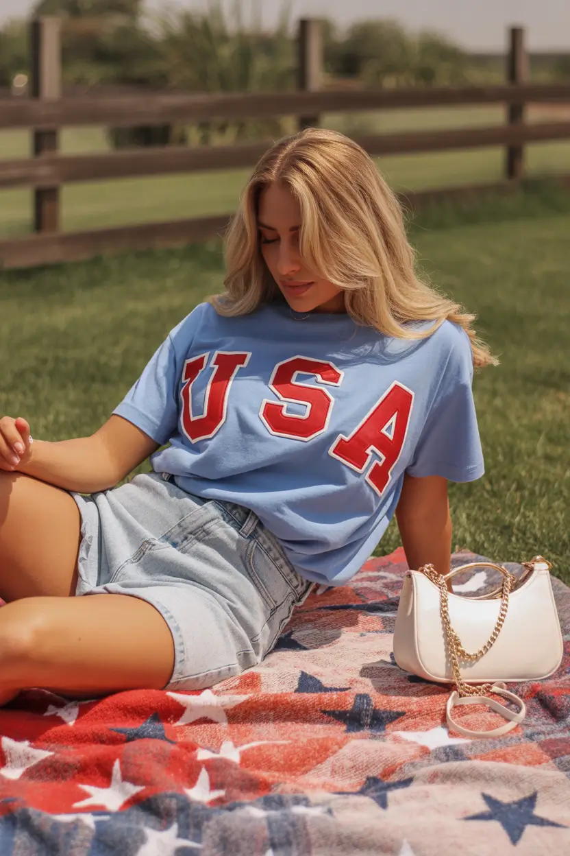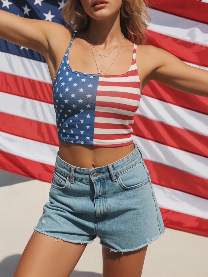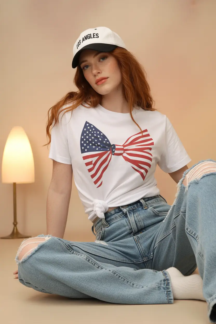 Nothing is better for July 2025 than a white tee with strong red “USA” lettering and high-waisted denim shorts. The style gives off a fresh and confident feel, and it’s easy to see how patriotic it is. With a mini flag in your hand and a sunlit porch as your background, this outfit clearly shows you’re ready for summer, whether you have plans at home or outside.