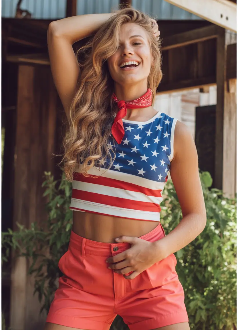 The outfit looks classy and chic at the same time, thanks to the white lace-up tank and high-waisted coral pink shorts. The presence of the red, white, and blue neck scarf adds a hint of patriotism without making it too clear. You can wear it for a summer day in Paris or as a guest at a wedding brunch in Ireland.
