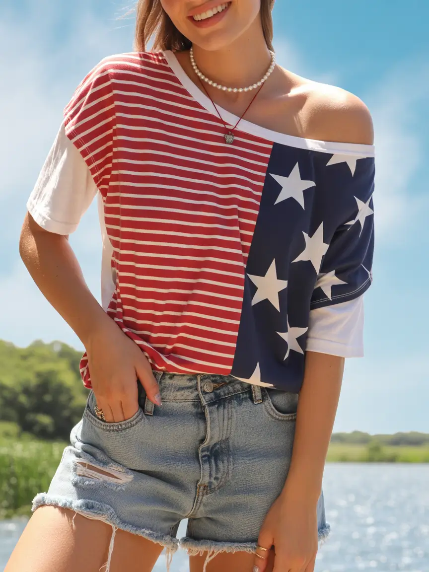 A tee that goes off the shoulder and features stars and stripes is an instant way to add a playful touch to your summer wardrobe in July 2025. The outfit is casual and cool, thanks to the light distressed shorts and the bright top. You can wear it for a peaceful day by the lake or for a leisurely walk in Italy on a hot summer day. The pearl necklace and pendant make the outfit look more feminine and keep the style interesting.
