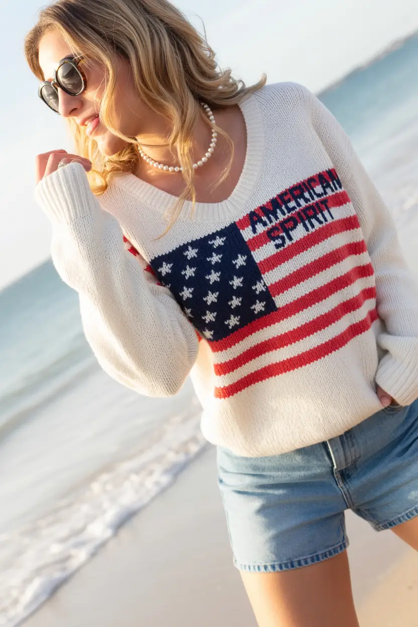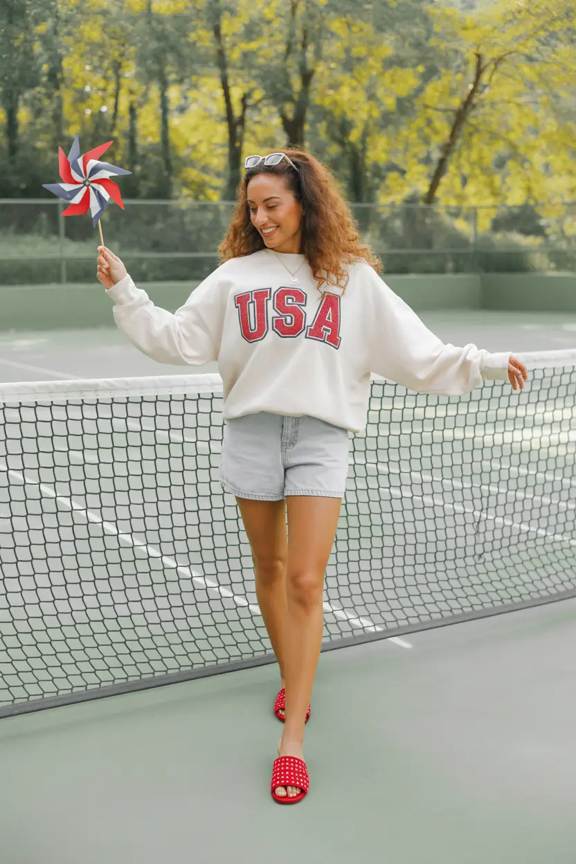 When it gets chilly, you can wear this large white sweater with the USA logo and high-waisted shorts to look fashionable and feel warm. Red studded slides add a fun touch that fits well for a simple Fourth of July gathering or a day of tennis in York.