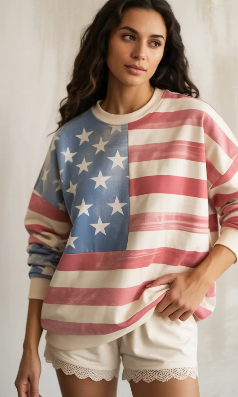 This combination is a masterclass in versatile basics. With its gentle vintage style, the sweatshirt is perfect for going from bed to shopping, and the shorts add a soft touch to the whole outfit. I’ve seen influencers on TikTok praise this kind of Americana capsule wardrobe piece as an easy way to celebrate summer with flair but no fuss. To me, wearing a bold top with neutral pants or jeans makes the whole outfit easier to wear and more balanced.