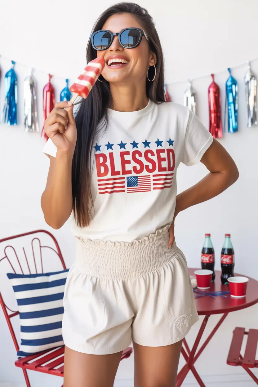 What do you think about graphic tees that can be used as a fashion statement? The “BLESSED” tee is just what you need for looking bright and happy in July, whether you’re at Disney World or having a picnic with friends for the 4th of July. The fabric keeps the shirt from getting stale, and the red and blue lettering adds a lot of energy. The real highlight is the smocked shorts with a high waist, as they add a feminine shape and a new texture to the look.