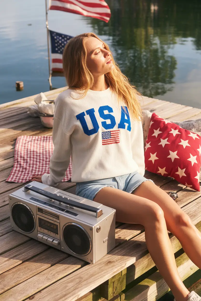 If the temperature drops in summer, you can stay warm and stylish in a sweater with an American flag design and denim shorts. The combination of the soft knit material and denim jeans gives the outfit a calm and well-planned look for evenings by the sea or casual birthday parties in Ireland.