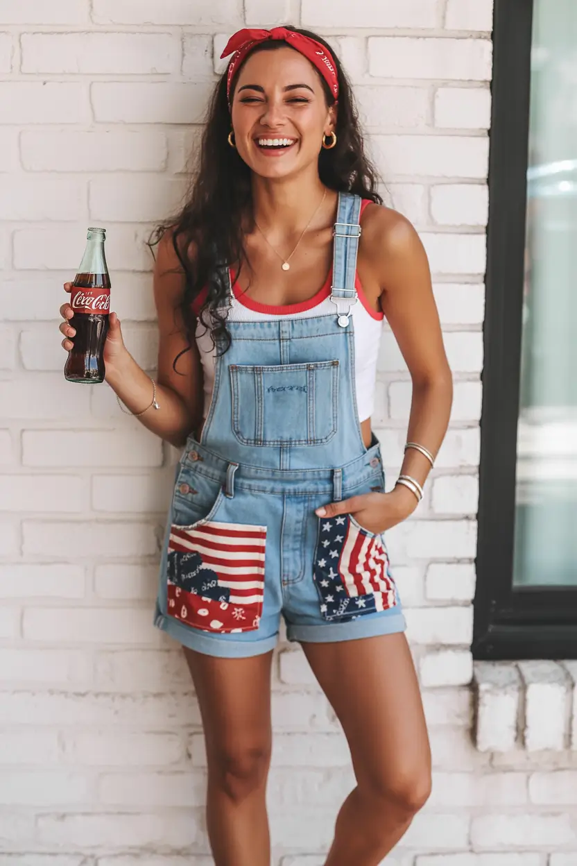 Denim overalls are always in style in summer, but adding American flag-inspired patches gives them a new, cheerful look. The red bandana on the head is a lovely throwback to the past, a bit like Rosie the Riveter, but with a lot more attitude. When you pair this outfit with a sporty white tank, it becomes a great choice for July activities in New York or while waiting at the airport.