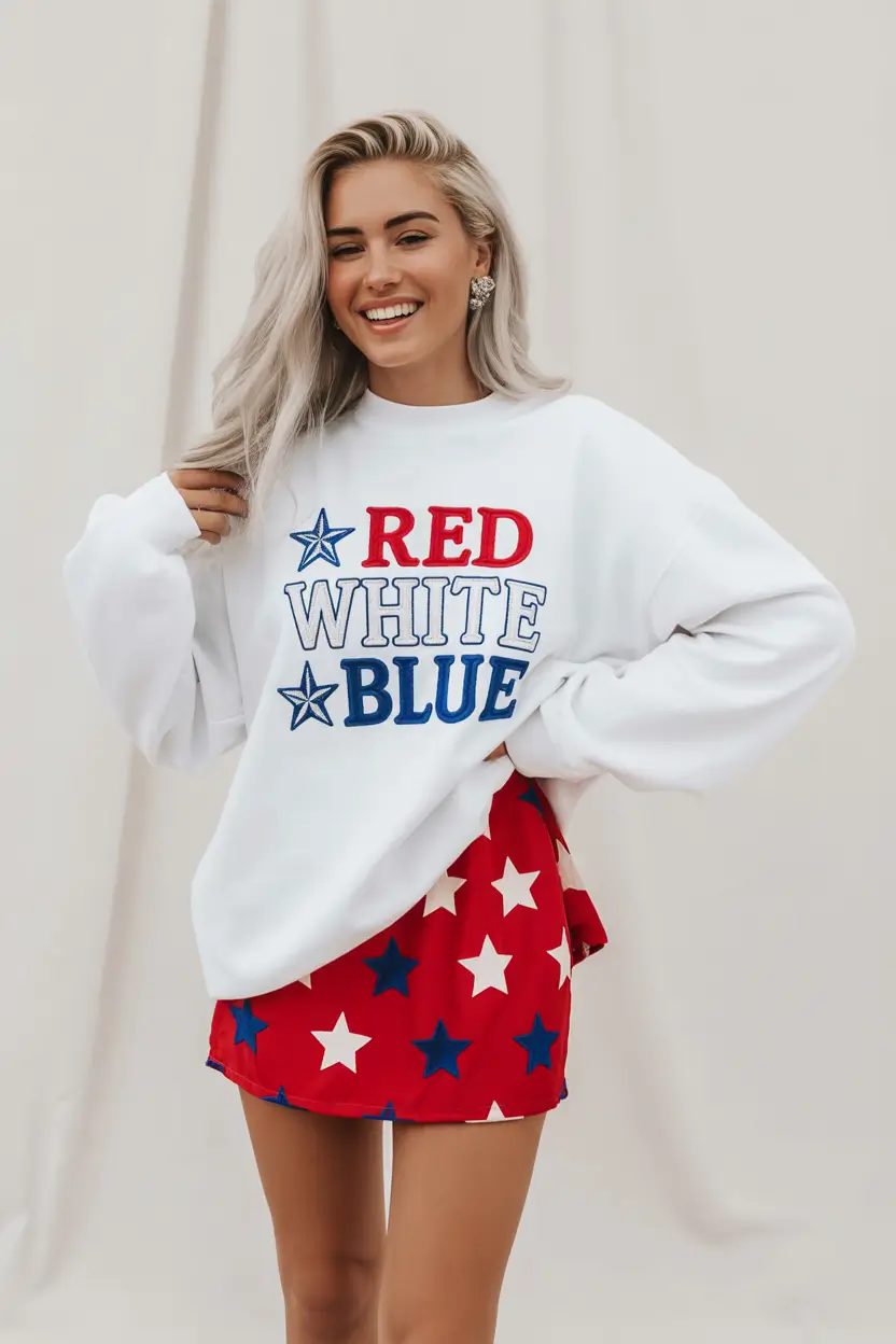 If you want to wear bold prints with something cozy, this outfit will be perfect for July 2025. The red, white, and blue letters on the sweatshirt look great with the red skirt, which is covered in stars — the look is lively and ideal for a casual Fourth of July or when traveling. The big fit of the sweatshirt makes you feel comfortable, and the mini skirt gives you a flirty and lively look.