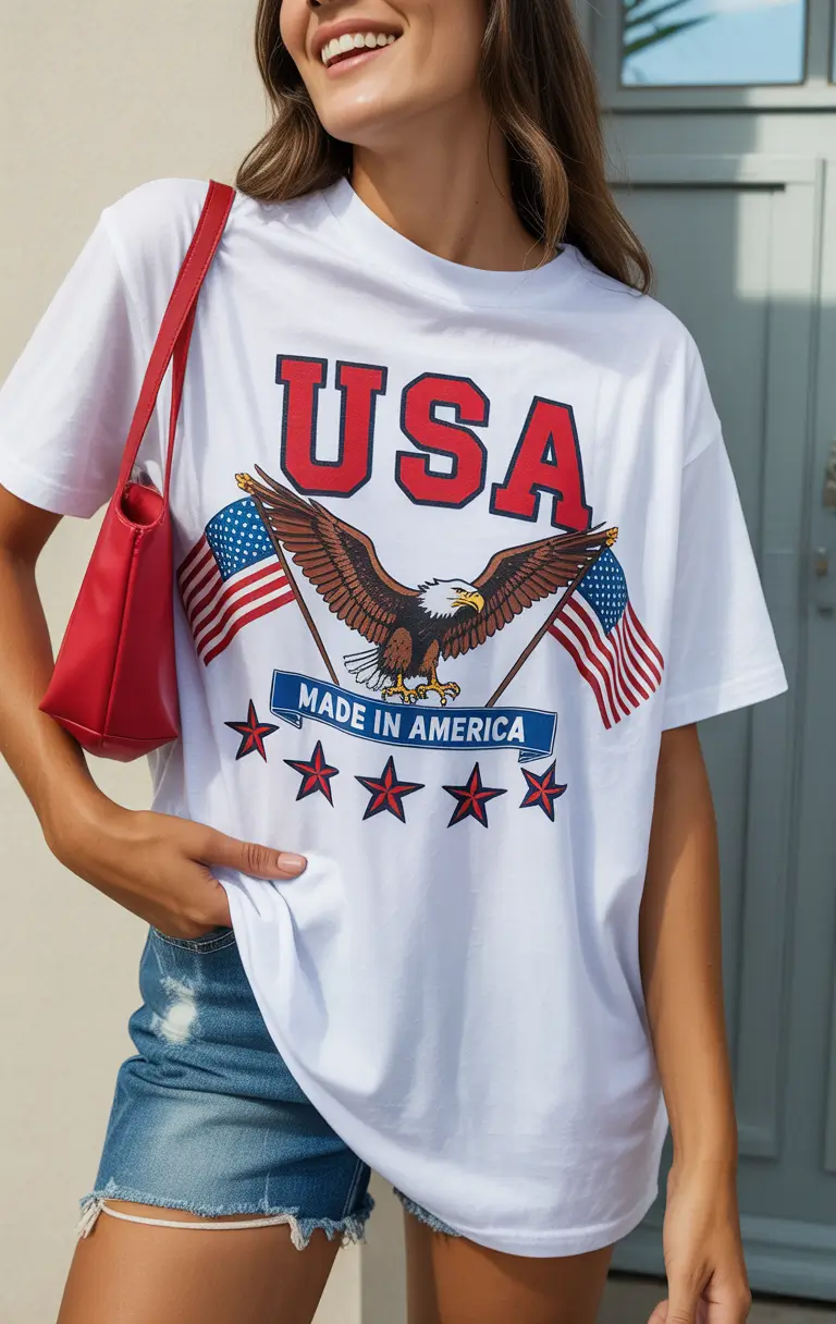 If you want to look American and fashionable at the same time, this eagle-themed graphic tee with the “Made in America” message is perfect for you. The crisp background makes the outfit stand out, and wearing distressed shorts gives it an extra touch that’s ideal for July, whether you’re celebrating at a party or leaving for an Alaska cruise.