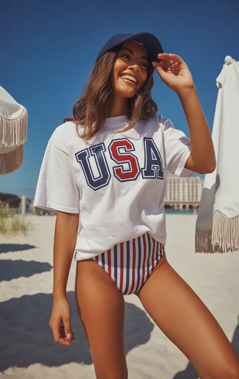 Here, the beauty is in layering, so a big, loose tee becomes a fast way to go from sunbathing to lunch without skipping a moment. The USA print gives the outfit personality, and the high-cut striped swimsuit is a tribute to the retro styles that are popular again. Remember that a cap protects your head from the sun and makes you look stylish at the same time.