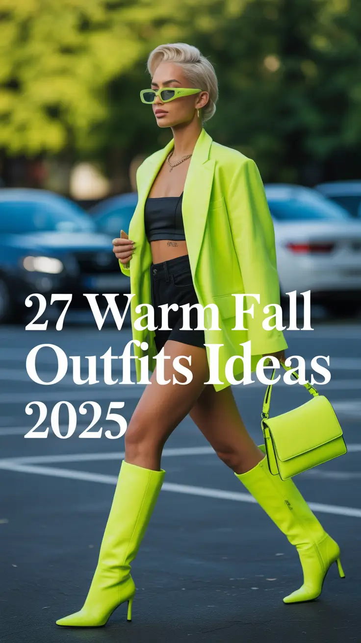 Fall doesn’t have to mean fading into the background. It is an electric yellow-green appearance that is all about breaking the rules and doing it without any fear. An oversized neon blazer, mini shorts, knee-high stiletto boots and a matching bag? Yes, please. It is editorial, it is bold and somehow it looks so beautiful in transitional weather.