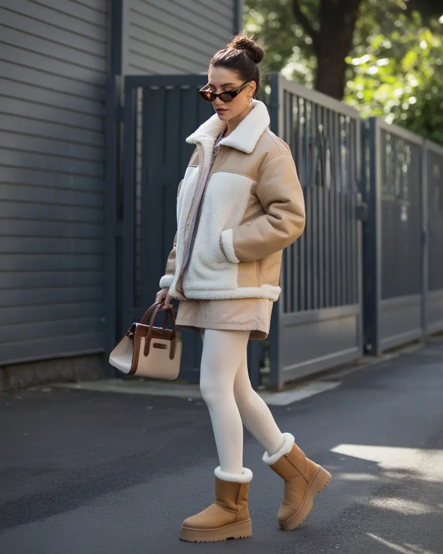 This look is a warm yet modern take on retro ski lodge glam. White thermal leggings, a tan classic ultra mini ugg sherpa-line bomber jacket in caribou shades, and tan Classic ultra mini Uggs is après ski without the lift pass. The sharp sunglasses and the top-handle tote provides a city-ready vibe, which the outfit seems to lack.