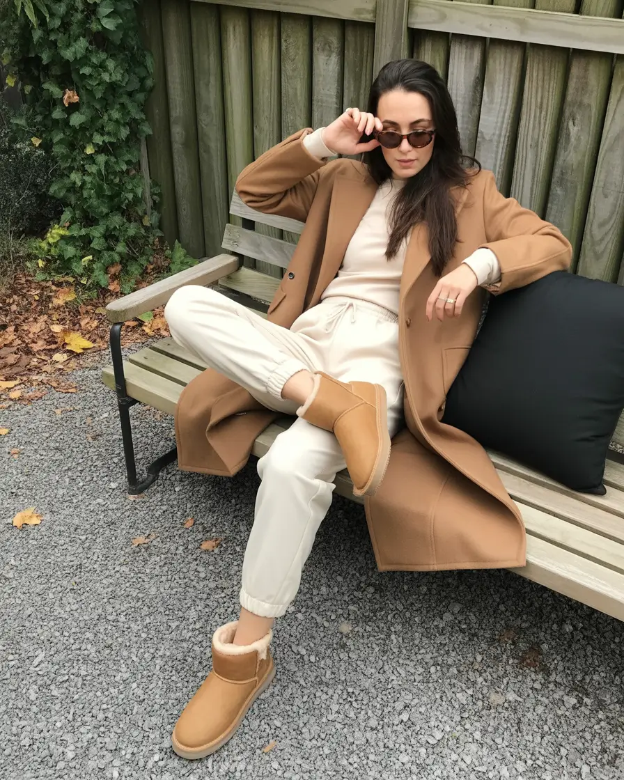 The outline of this Uggs outfit is a mini love letter to quiet luxury. The Platform mini Uggs (Caribu color is a massive hip hip hooray!) give you just the right edge while keeping your toes toasty. The coat focuses with my head turning, a timeless piece that zipped with both fall and spring. Oh the tapered joggers – you keep them to show off the shoes while staying nice and warm, plus, you don’t miss the value that warmth and chic style.