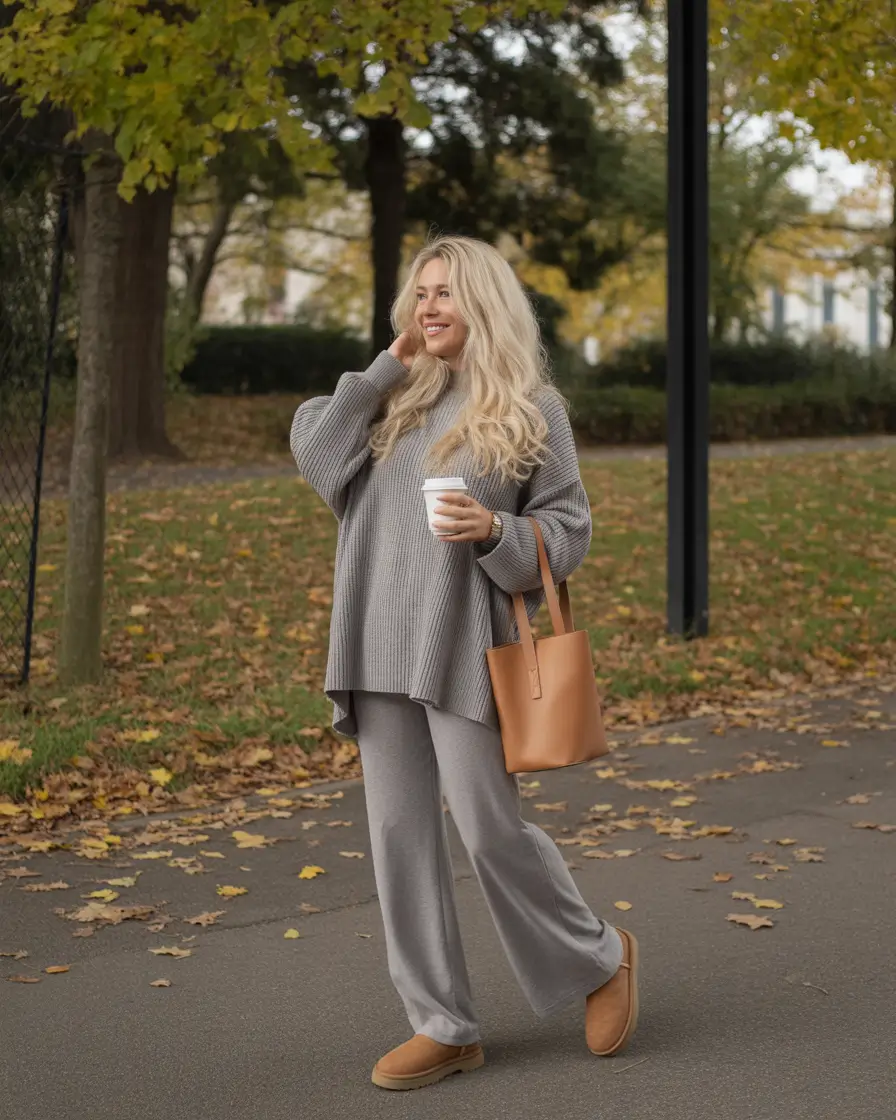This one is for my girls who love all grey or tonal dressing. Not too flashy, and not too loud. Confidently minimal. A chunky knit sweater drapes with ease over wide leg trousers in a matching cool grey and soft Goldenstar clog Uggs nicely warms the outfit. A nice warm hug is created by the caramel tote and perfectly waves that finish the outfit.
