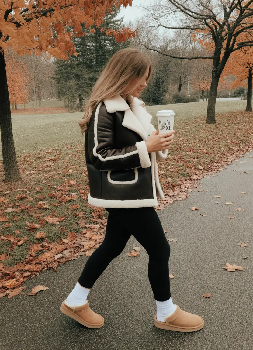 This trend is here to stay and is proven with this look. We’ve got a seamless, breton rib knit matching set with the color Oatmeal Styled with ultra mini tan Platform Uggs, contrast with a leather jacket and beanie worn for casual wear. This Uggs outfit 2025-2026 is the haute couture necessary for cold, cozy days by the fire—but make it street style.