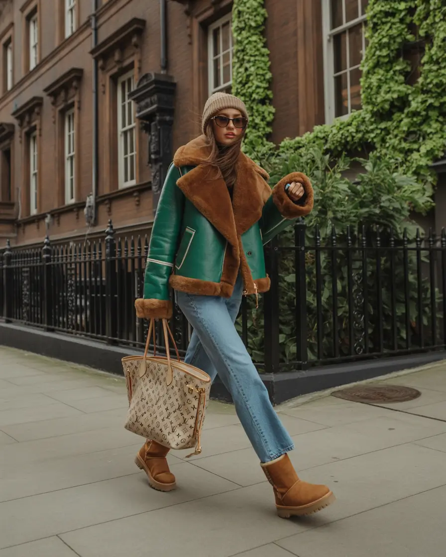 There’s something really cool about juxtaposing awesome winter classics to a loud and statement coat. This look has a very striking green shearling aviator over a comfy brown sweater with striking brown sweater and a Uggs mini. The unexpected richness of the green gives the outfit a runway twist, while the accessories-beanie, oversized sunnies, designer tote-pull the look together in a cool, off-duty vibe.