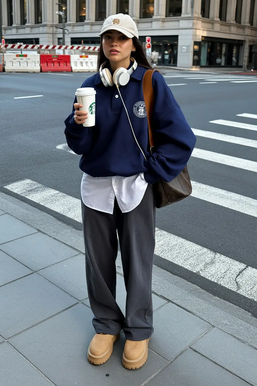 This outfit is what happens when a lazy Sunday look gets upgraded. The Black ultra mini Uggs are perfectly peeking out from under chunky socks and leggings, and are paired with an oversized sherpa zip pullover and a dad cap. It is the type of outfit that says, “I do care, but not over the top.” The Chanel tote adds that surprising high-low mix and boom, instantly elevating your rest-day outfit to street-style level.