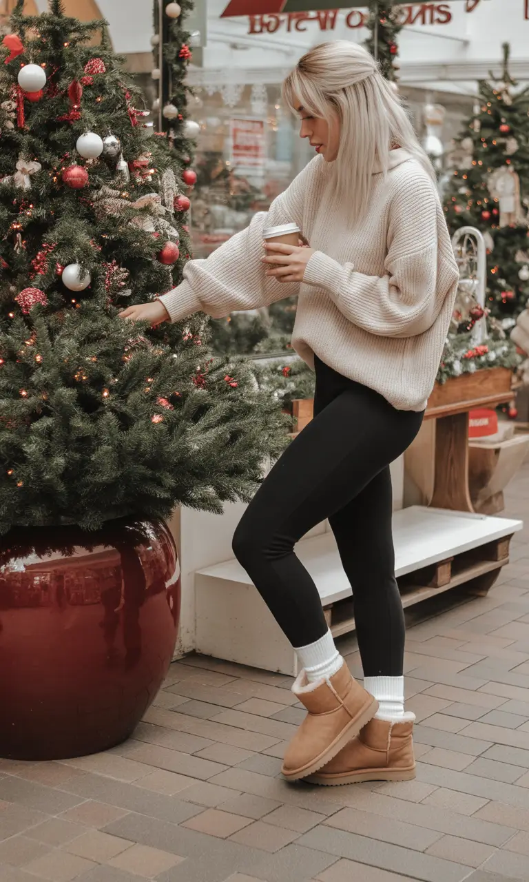 Each winter wardrobe cannot miss the oversized knit that is blanket-like comfortable, yet still chic, knit. Lately, the focus is balanced volume on top and tidy below. A dress length chunky beige sweater worn with black leggings and a pair of Platform ultra mini Uggs in chestnut provides style and comfort in equal measure. White crew socks and a high ponytail completes this look crafted on the edge of polish and comfort.