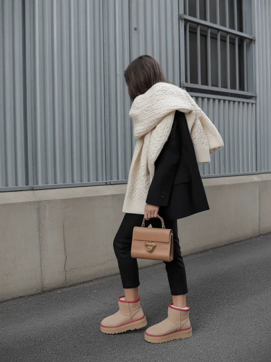 This is one of those looks that looks expensive even if none of it is. The trick? Rich texture contrast. Every piece has presence, from the Platform boots to the structured tote to the buttery scarf. The softness is sophisticated, not sloppy.