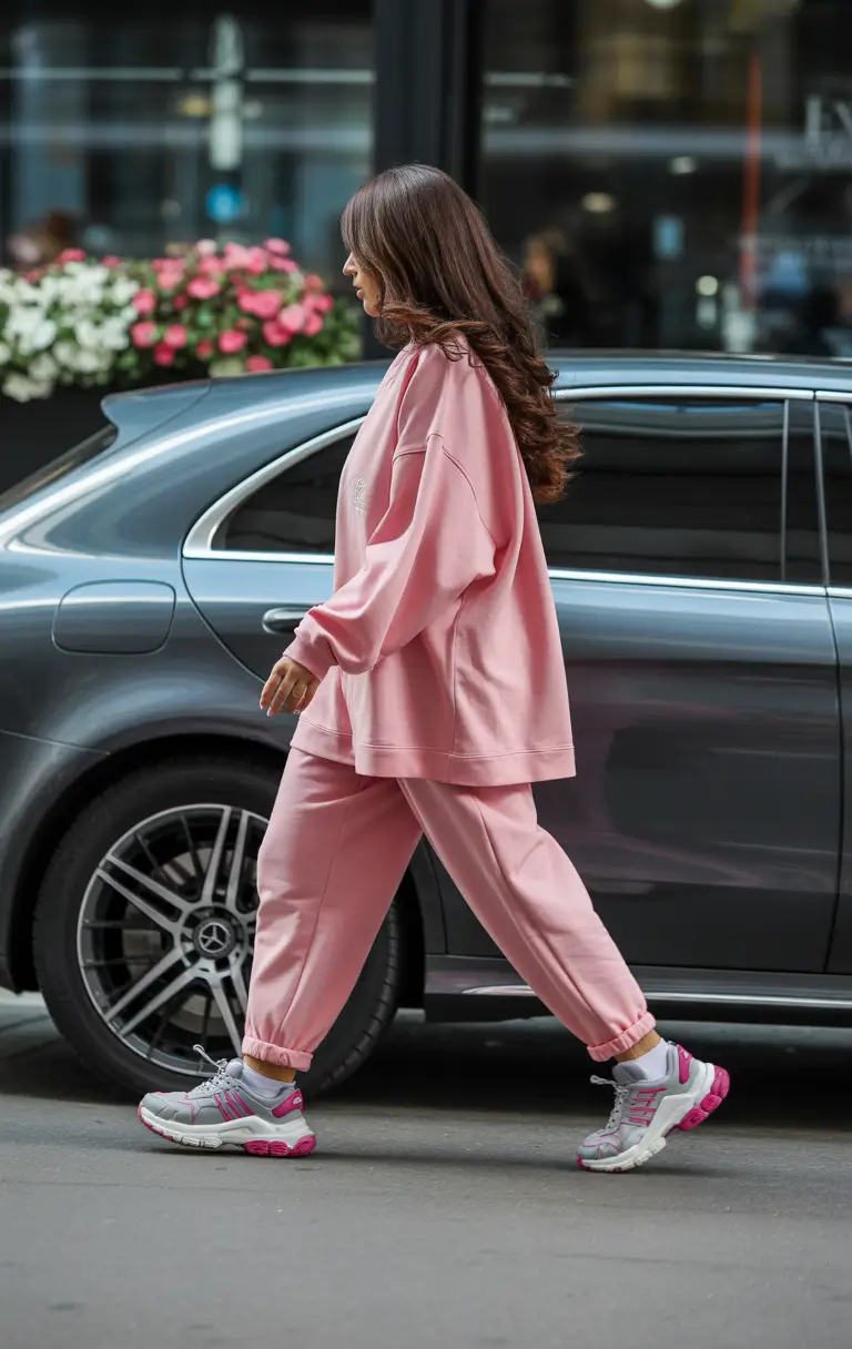 The outfit is styled with glamour and is also cozy, which is perfect for the ‘athleisure’ trend of 2026. Wearing a matching pair tends to boost one’s mood very quickly. It is one of the most stylish and comfortable outfit set, especially when styled with sporty sneakers.
