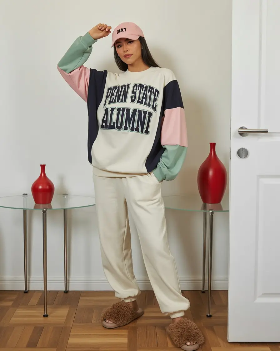 You know that “lazy but cute” vibe we are all trying to get? This is it. A slightly oversize varsity style sweatshirt, matching cream color joggers, and a pink cap that adds just the right amount of flair. It’s the definition of dorm room energy, but make it Pinterest worthy. Whether you are dashing to class or just don’t feel like putting effort into your outfit, this one is for you.