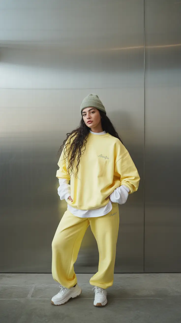Tracksuits are iconic, but there’s something effortless about one that’s a soft lemon sorbet pastel; especially when it comes in a monochrome set. The oversized sweatshirt gives off the “nonchalant, I just woke up” aesthetic while it’s carefully styled with a white undershirt. It is completely intentional, everything is in relaxed fit. The set is styled with sweatpants, chunky white sneakers, and a sage green knit beanie for a completion. This captures the entire winter outfits aesthetic for 2025-2026. It has the perfect amount of sporty and casual while keeping warm and charming.