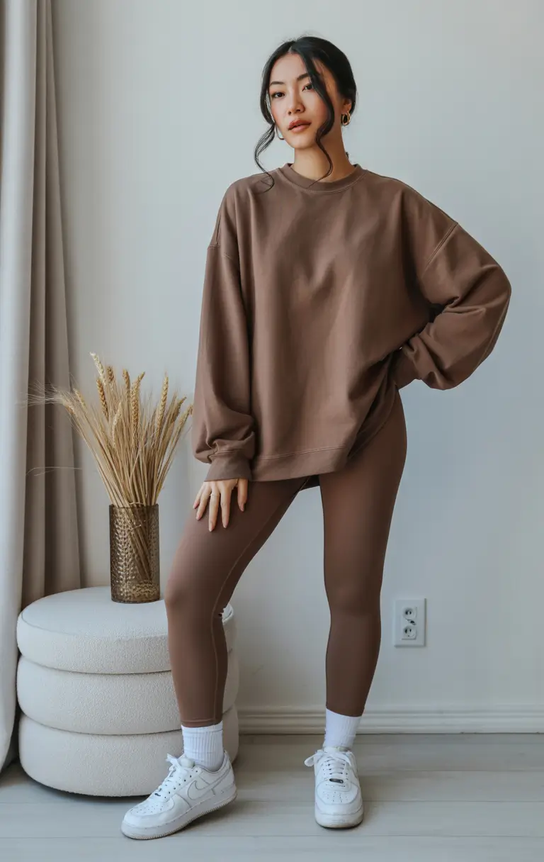 Describing this outfit as grounded, relaxed, and quietly confident is just what the warm chocolate tones are like. The ensemble combines an oversized brown sweatshirt and high rise leggings in the same color. It has that boring, but not boring, neutral component that makes most lay people appreciate this. It is labeled as simplistic, but it is totally effective and practical for winter. The hoops and sneakers adds a fabulously, chic touch that is apt for a day out. It is a vibe that any chic lady would love.