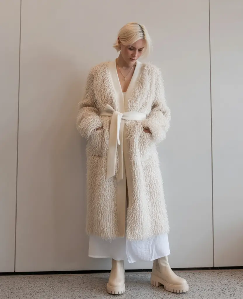 Now that’s what I call elegant warm. I mean, the long, fluffy cream robe-style coat, cinched with a soft belt, layered over flowing whites and topped with chunky beige boots—it’s a fashion version of a marshmallow hug. The monochrome palette adds that dreamy minimalist tone, while the shag coat gives the whole thing texture and movement. It’s soft, yet sharp. Quiet, yet bold.