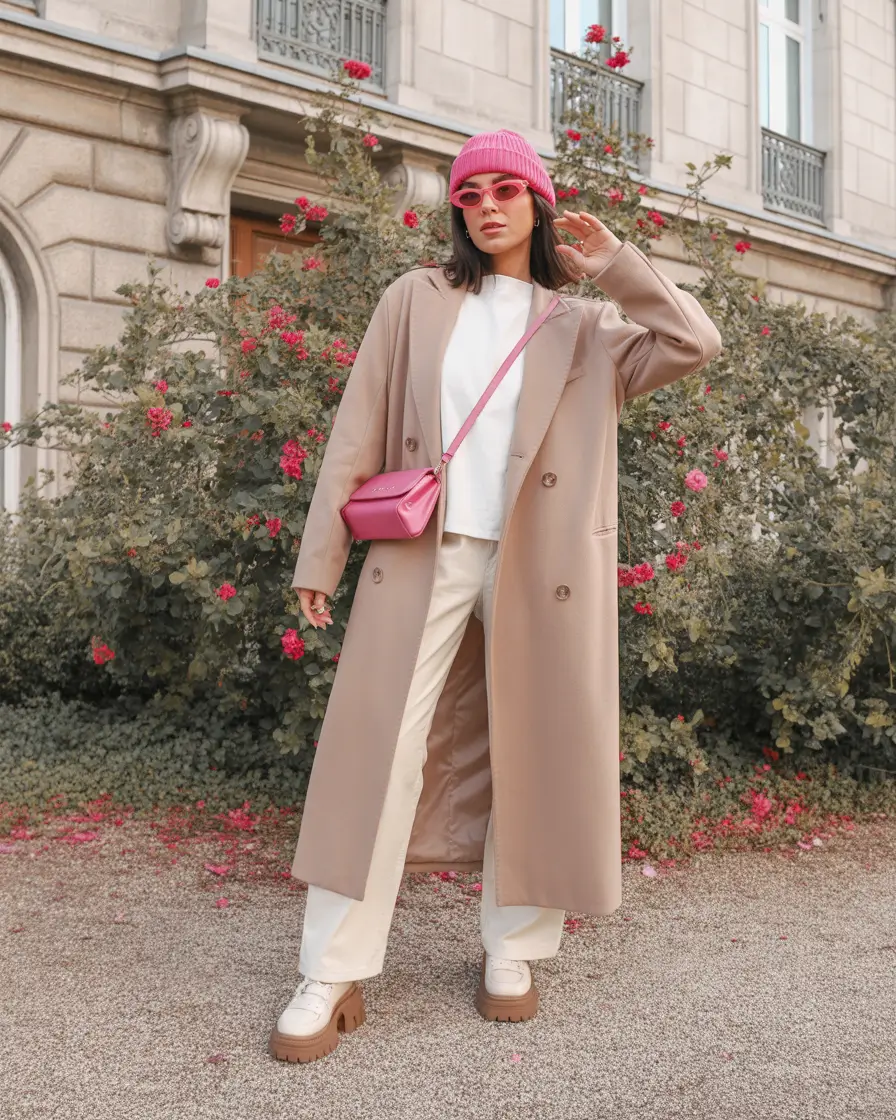 Let’s explore it a bit more: the neutral long coat is perfectly complemented by the cream wide-leg trousers and boxer fit white t-shirt. However, the ensemble is elevated with the super glossy and shine hot pink beanie, sunglasses, and crossbody bag. The Y2K vibe is strong here, but it is more mature which reminds me of a Paris Hilton and a simple Scandinavian girl. High fashion meets minimalism.