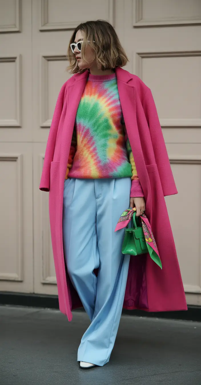 For those who do not want to be a wallflower, a bright rainbow tie-dye with pastel wide-leg trousers and a hot pink coat with an emerald green bag is fearless and, surprisingly, able to be worn. These are the kinds of bright joyful winter outfits aesthetic 2025-2026 that bring joy and stop traffic.