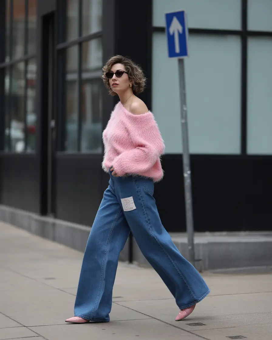 Which one do you picture when I say fluffy pink sweater – Barbie or boss? This outfit does a case for both. Its slouchy and fuzzy pastel look paired with the deep blue wide leg jeans and the ballet pink heels has confidence. Its flirty and feminine, and the contrast is a little rebellious. The winter outfits aesthetic 2025 2026? Perfect for the transitional fall and winter days.