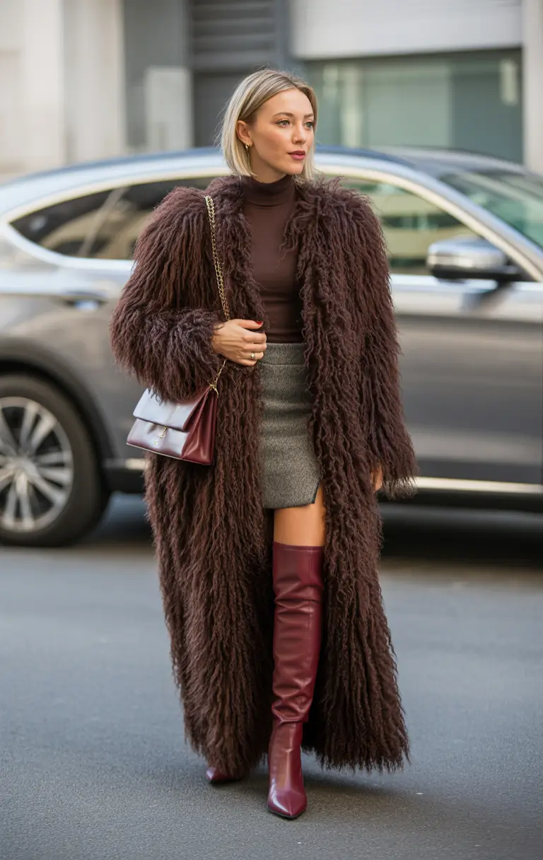 This is what you get when maximalism meets elegance. A rich brown and red outfit with plush fabric and tailored finished looks like you can sip on mulled wine while wearing it. The shaggy, dramatic, floor length coat and the fitted turtleneck and mini skirt come together beautifully. Don’t get me started on the deep wine red boots, total show stoppers.What catches my attention are little details likes the fine knit top, the gold chain strap on the purse, as well as the skirt showing underneath the coat. Those choices add polish. And this color? Deep brown is one of the warmest, most elegant shades on the market for 2026. And the color is everywhere. From knitwear to puffer jackets.