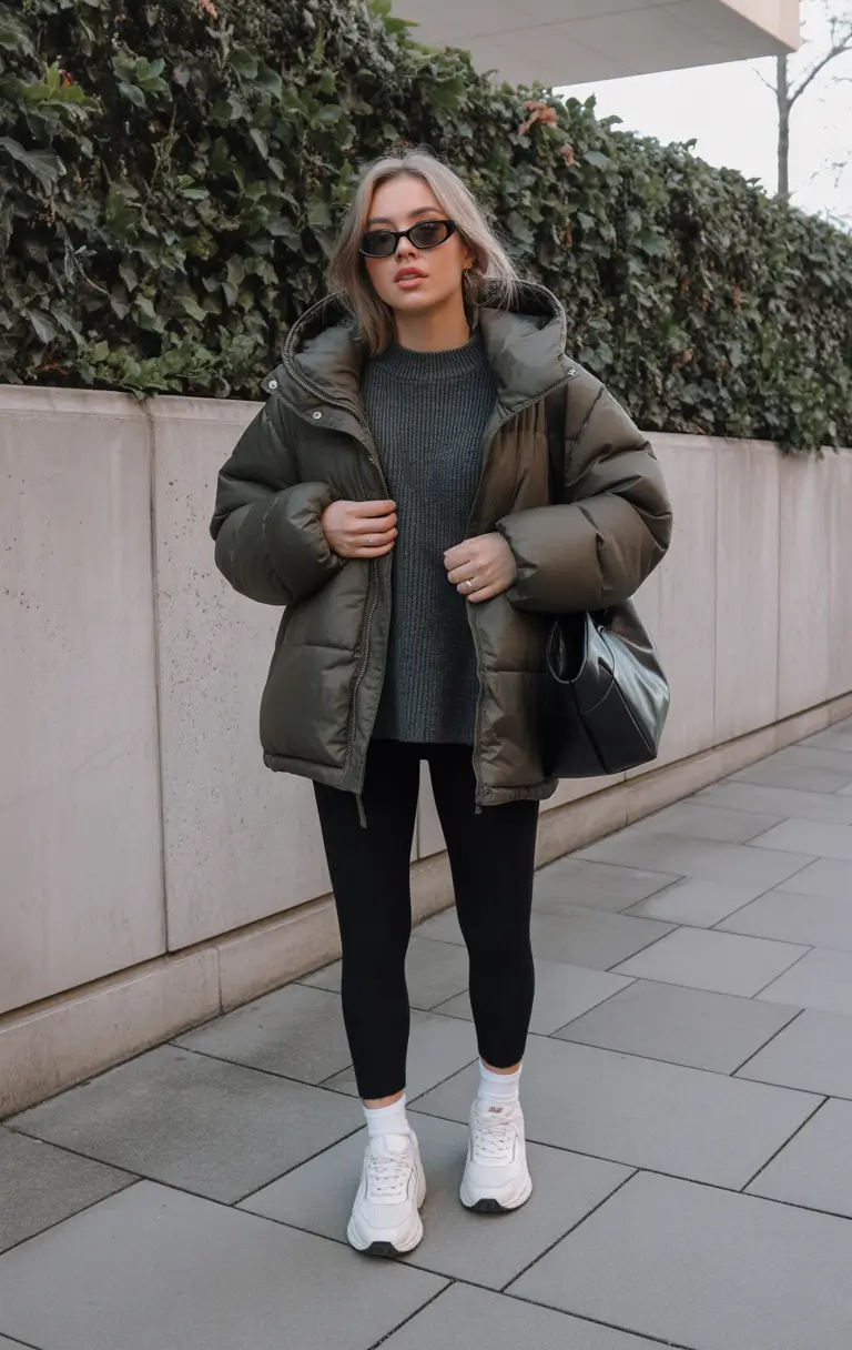 Casual fluent city speak in my opinion. The olive green puffer is worn over a chunky knit, black leggings, and white runners – an outfit I personally wear a little too often in winter. And honestly? I don’t intend on stopping.