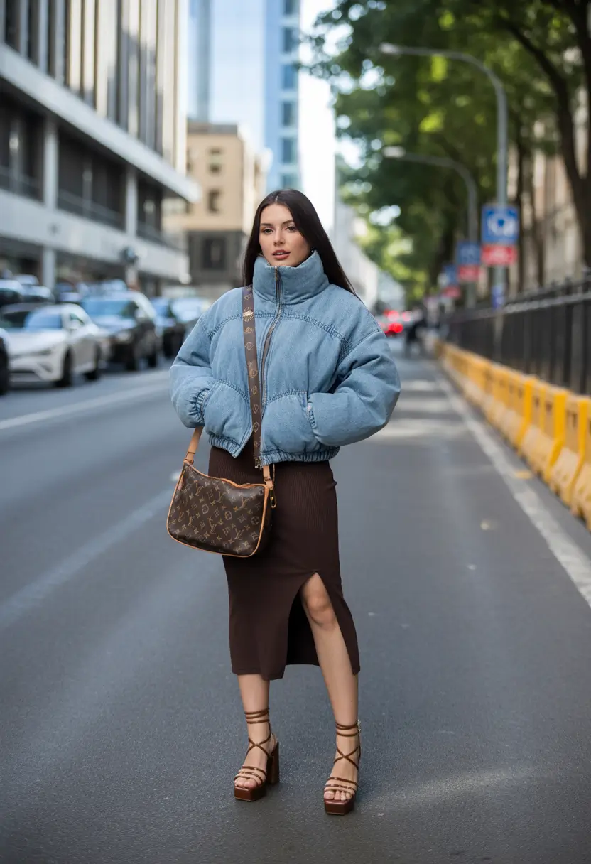 The short cut of the puffer hits perfectly at the waist, creating definition against the longer line of the skirt. That mix of cozy outerwear and a leg-baring silhouette just hits different. The Louis Vuitton crossbody adds heritage flair without sacrificing the feel.