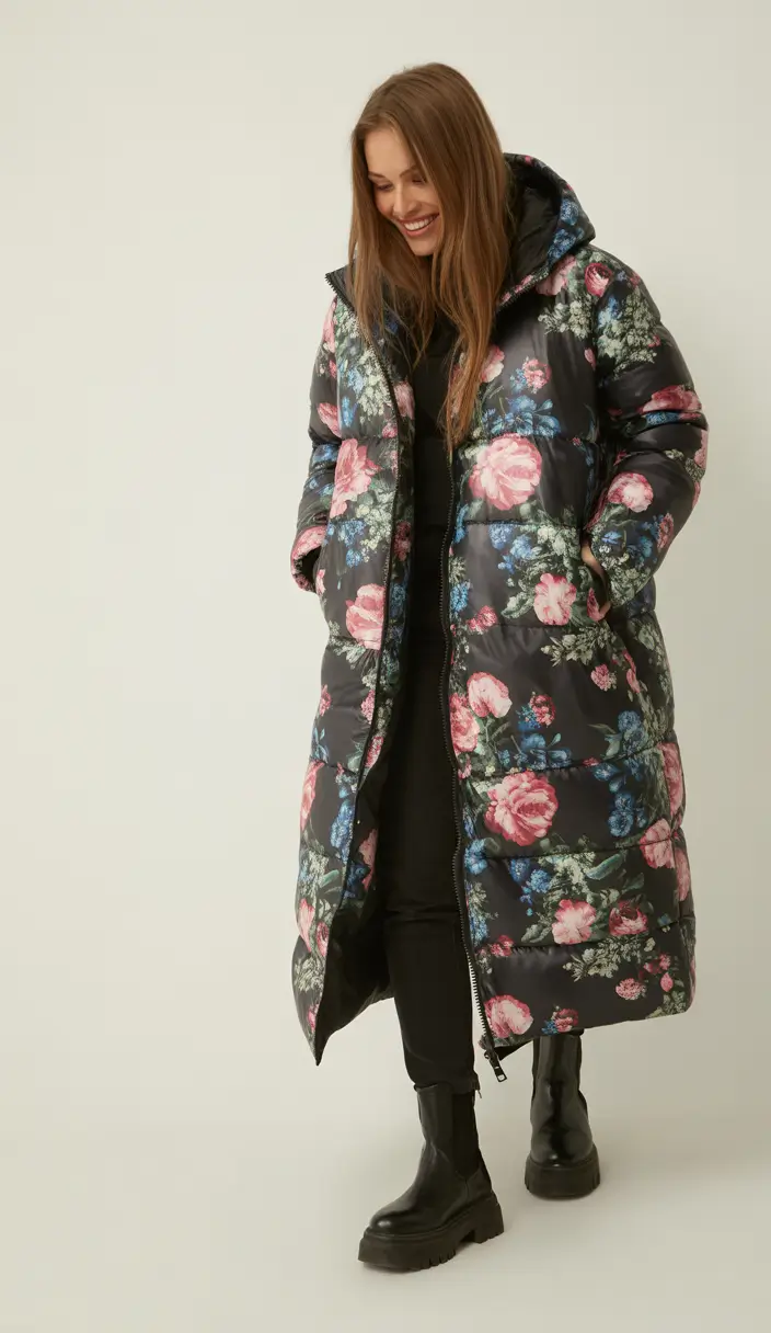 This Long Puffer Coat is an oversized coat that has an artistic shape which goes beautifully with the base layers black leggings and a turtleneck. The floral print also allows versatility with accessories. Choose from the coat color to match your hat and gloves along with the chunky black boots to create an elegant fierce look.