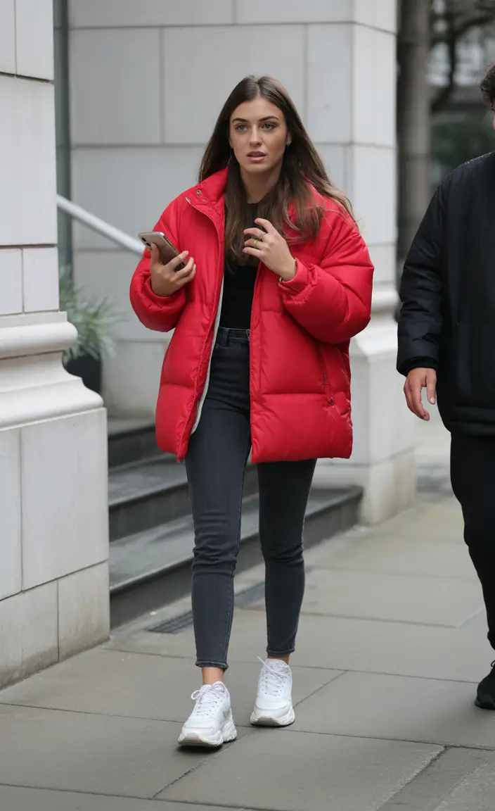 There are days that you want to wear your most comfy skinnies and have your puffer jacket do all the talking. This puffer jacket in vibrant red. It turns the wearer into the ‘main character’ . Since the wearer also has a classic black top on along with black sneakers, this outfit is considered ‘casual cool.’