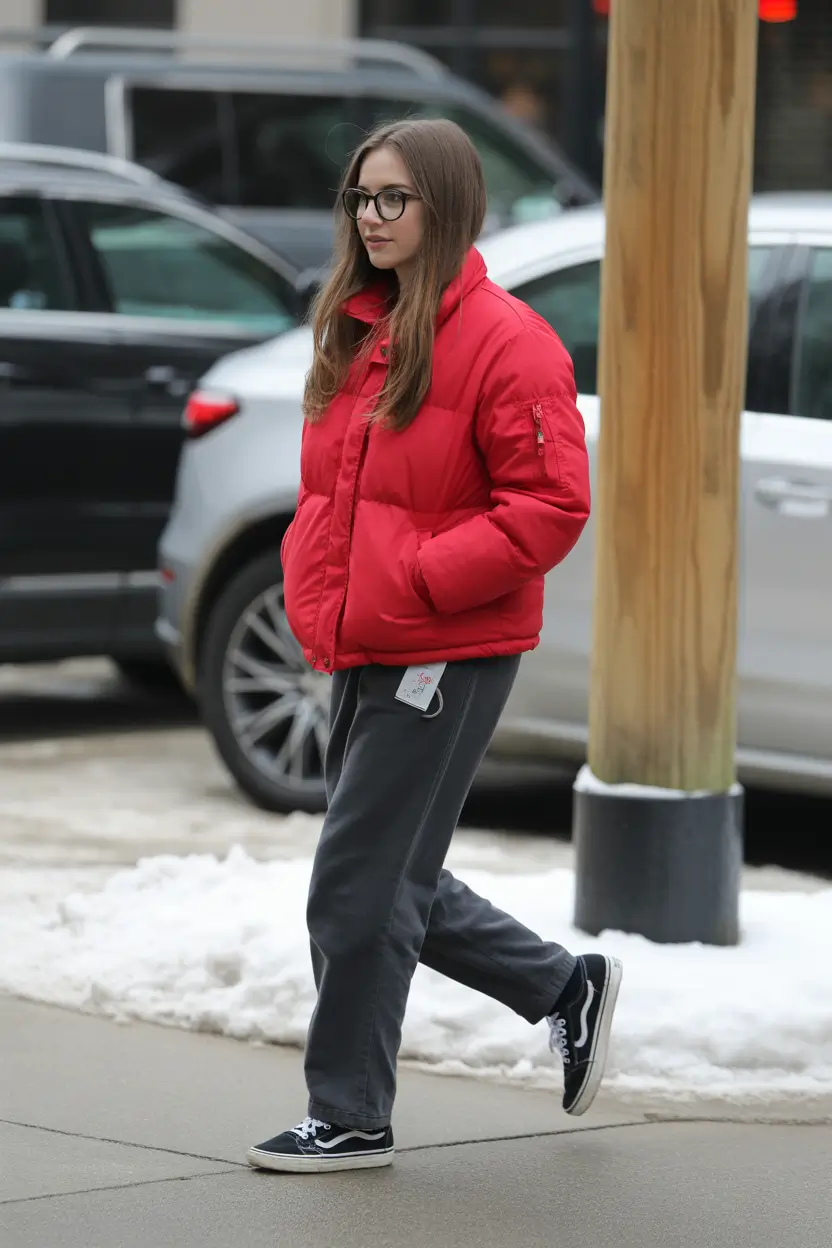 No, Maybe, this is one of those throw-on-and-go looks, but it feels completely current. A true short puffer in bold red, layered over easy charcoal sweats, and classic Vans gives the perfect nod to streetwear, but without overdoing it. There’s something so effortlessly cool about the combo, and it does remind me of teen style, but grown-up.