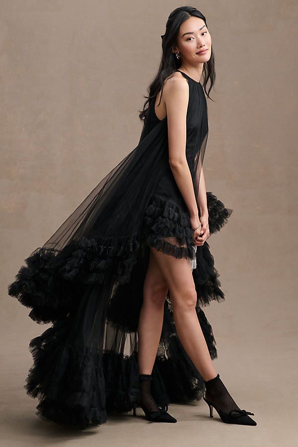 A high-low hem (or asymmetrical hem) dress is shorter in the front and longer in the back. This dynamic style allows you to showcase your legs and shoes while maintaining the elegance of a longer dress in the back. It’s playful, stylish, and perfect for dancing the night away!