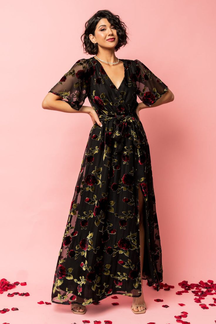 Elegance is the name of the game here. Long-sleeved gowns, dark shades, and a hint of sparkle make for a timeless winter look.