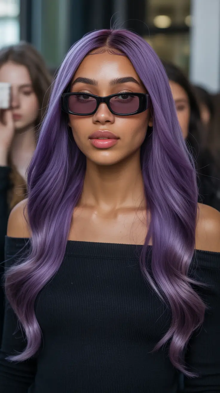 Violet hair is easily one of the boldest yet most mesmerizing choices for hair color for dark skin 2026. This shade leans luxurious rather than neon, giving the hair a silky, jewel-toned finish that feels incredibly modern. The long, sleek styling adds sophistication, keeping the look elegant rather than playful.