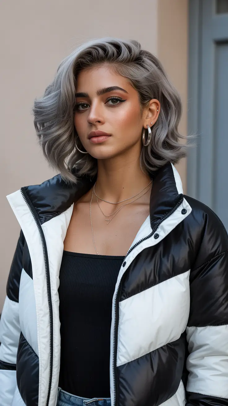 This blend of platinum blonde with deep ash gray ends feels bold and futuristic, yet it still works beautifully on tan skin. The top half stays soft and luminous, while the darker sections add definition and a little edge. I’ve always admired how two-tone looks like this transform even simple outfits.
