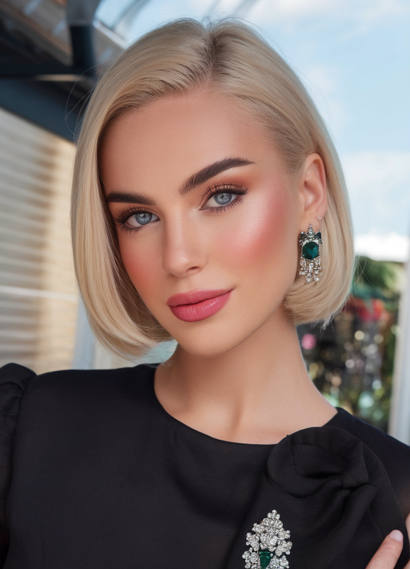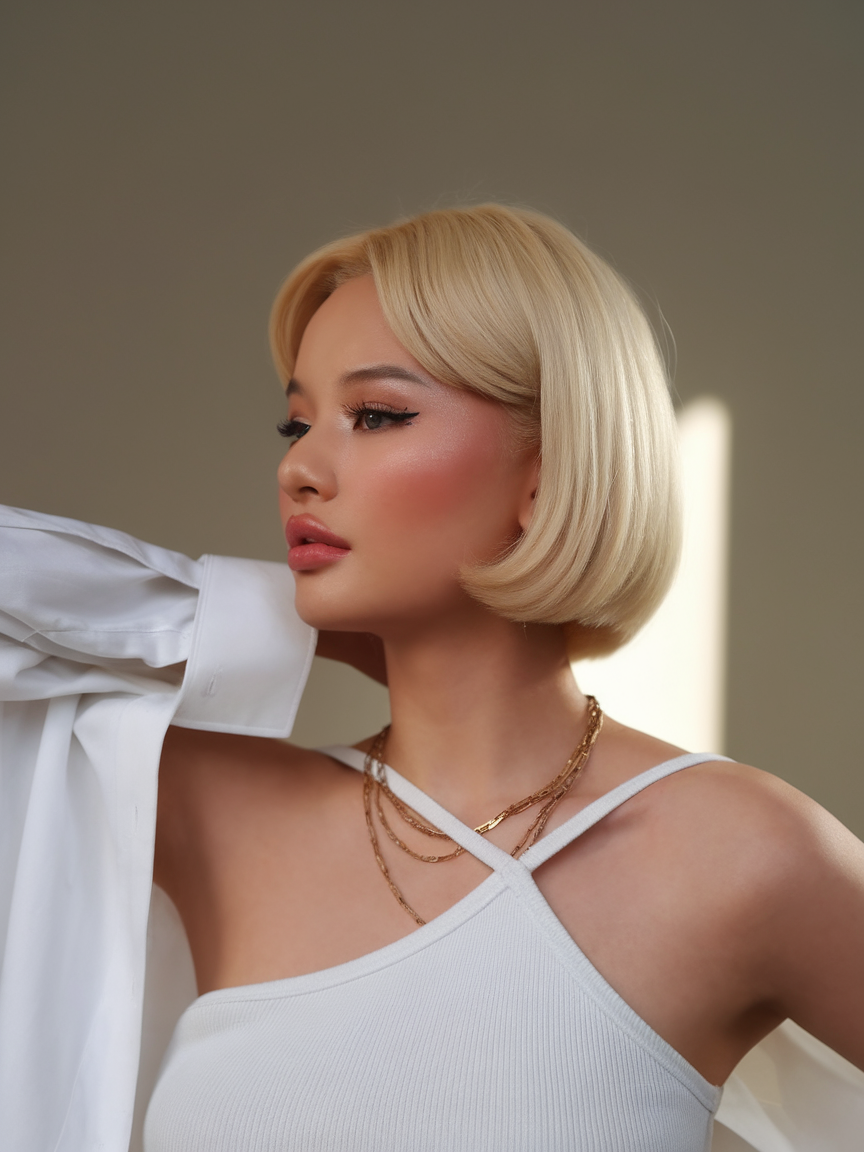 This elegant cut which is a few inches below the shoulder, has plenty of volume making it one of the best bob hairstyles for women with thick hair who want to look effortless while still feeling luxurious. The face and hair is softened by the creamy blonde shade. The encapsulated, styled under ends are modern and clean, making it look beautiful for the year 2025. One of the best selections among Best Short Haircuts for Summer 2025: Trends.