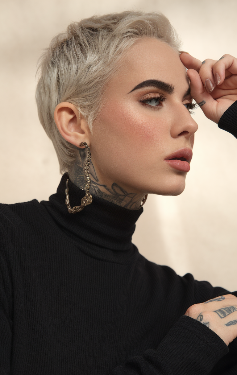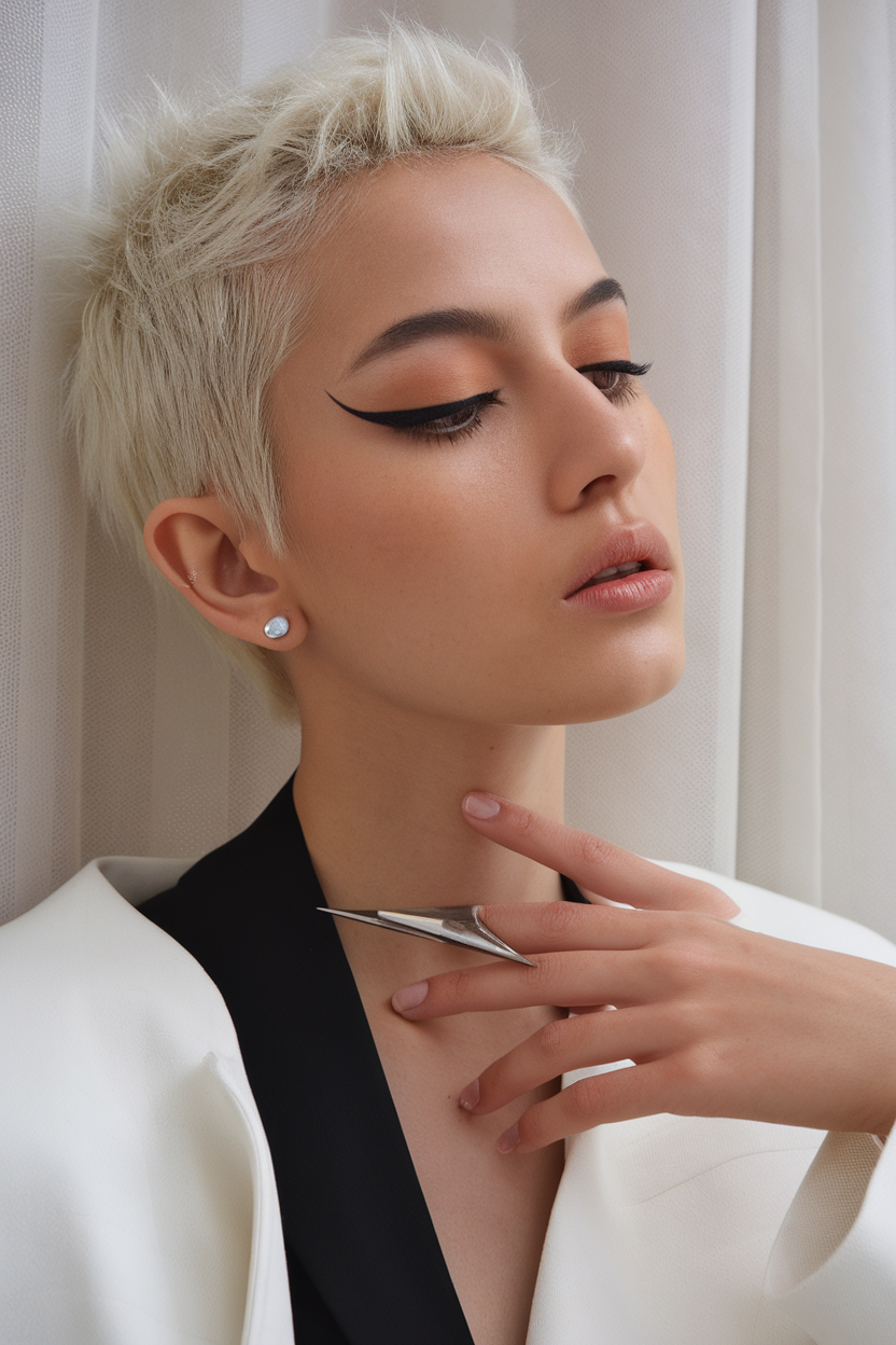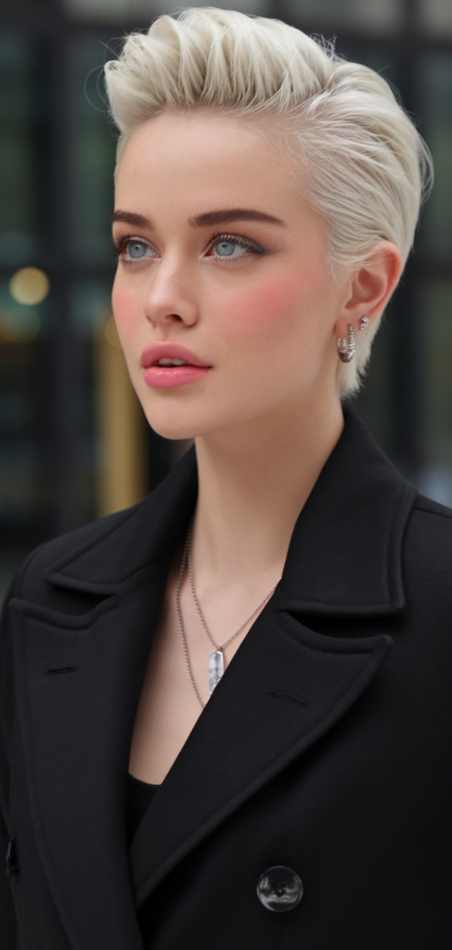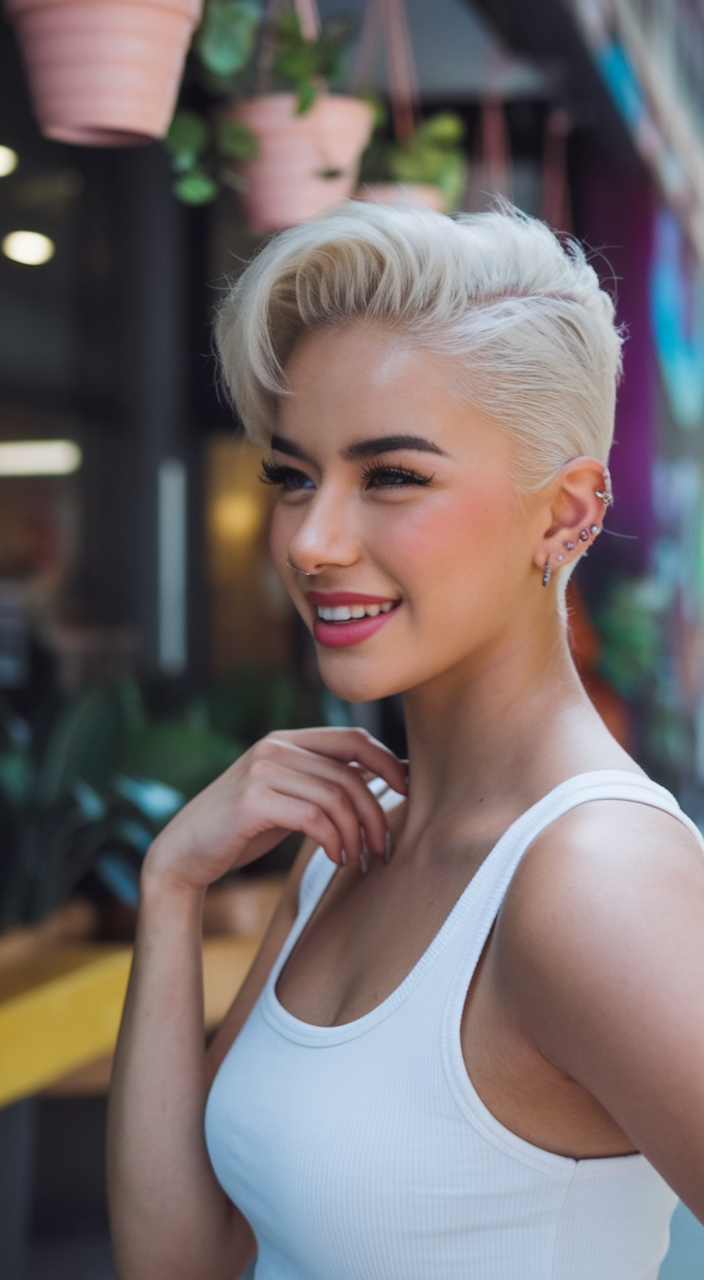 This icy blonde faux hawk variation sees volumetric height through the top blended with frizzy sides. Sharp angles are perfectly suited to the borders of the icy blonde tone and replenish the silhouette, making this a daring look for women’s hairstyles in 2025. These are perfect alongside bold personas who want an effortless style with a splash of fun. The faux hawk variation serves most powerfully on the list of best short haircuts for summer 2025.
