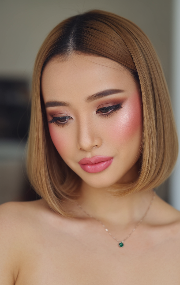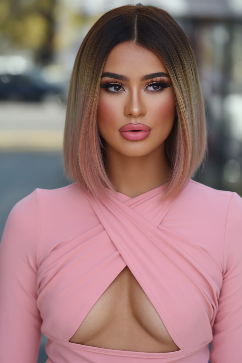 Smoothly centered, the shiny bob transitions from deep brown roots to soft, rose pink at the edges. This precise cut is quite sharp and gives shape, unlike the hair color for brunettes which is bold for 2025 trends. Considered one of the more riskier options among the Best Short Haircuts for Summer 2025: Trendi Ideas, it is excellent for women seeking balance between masculinity and femininity.