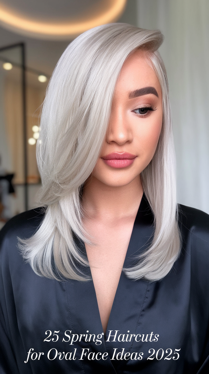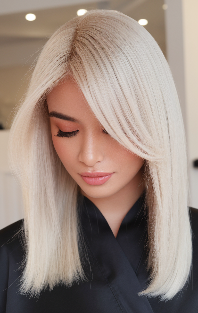 This medium hair look features a sharp, blunt cut that enhances the sleek and straight texture. The icy platinum blonde shade gives a bold yet sophisticated touch, making it stand out. A subtle side-swept layer in the front adds a soft dimension while maintaining a polished, modern aesthetic. Perfect for those who love a minimal yet striking spring haircut.