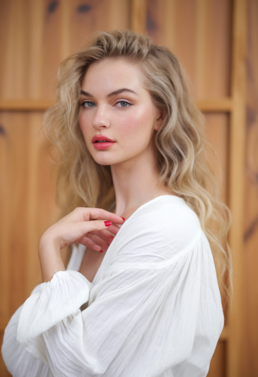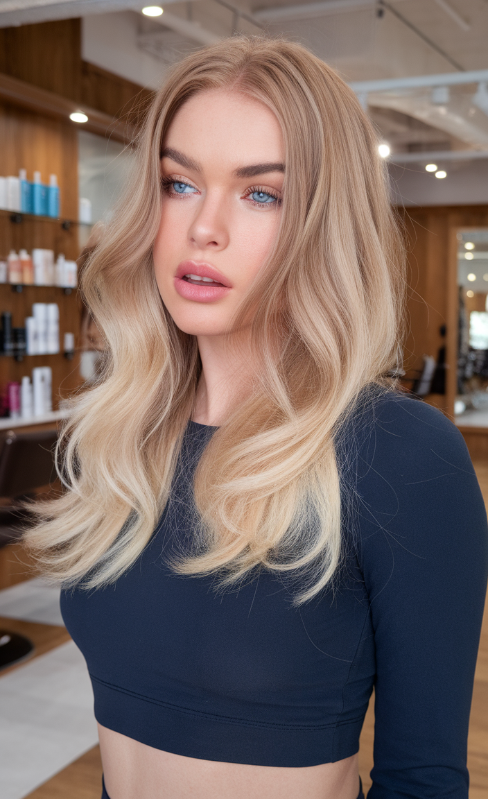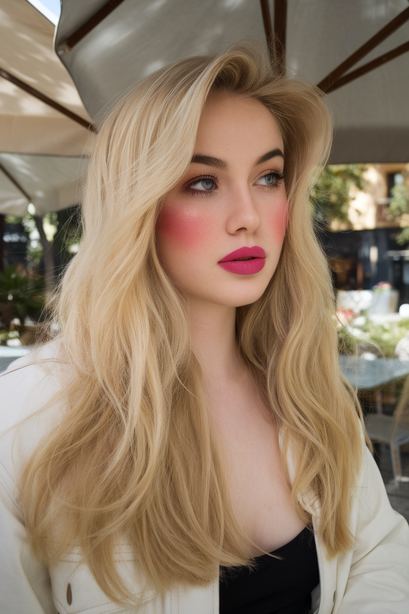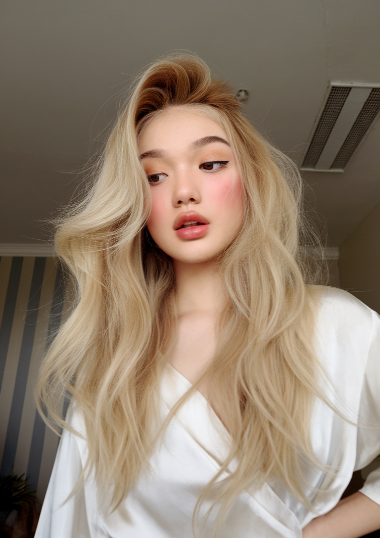 This long hair style features textured waves with a voluminous lift at the roots, adding height and dimension. The golden blonde shade with soft highlights enhances the airy, weightless feel of the hair. The tousled finish gives a natural, effortless appeal, making this an ideal spring haircut for an oval face shape. This look is perfect for those who love relaxed yet voluminous styles.
