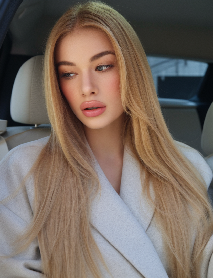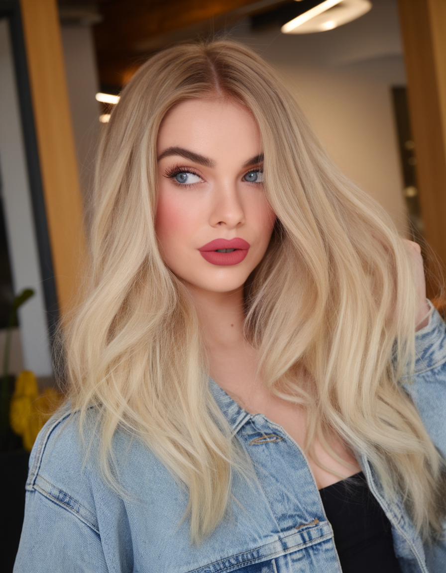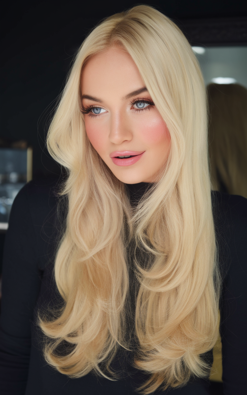 This long hair look features soft layers that add movement and volume while maintaining a sleek, refined shape. The icy blonde shade enhances the hair’s shine, making it a perfect spring haircut. A gentle wave at the ends adds a touch of elegance, ideal for those with an oval face shape who want a polished yet effortless style. This look is timeless and versatile for any occasion.