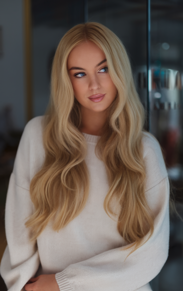 This long hair look features voluminous waves cascading effortlessly, adding texture and movement. The deep side part creates an elegant frame for an oval face shape, enhancing symmetry and softness. The warm blonde shade gives a luxurious finish, making this an excellent choice for those seeking a glamorous yet natural style. Perfect for special occasions or an everyday chic look.