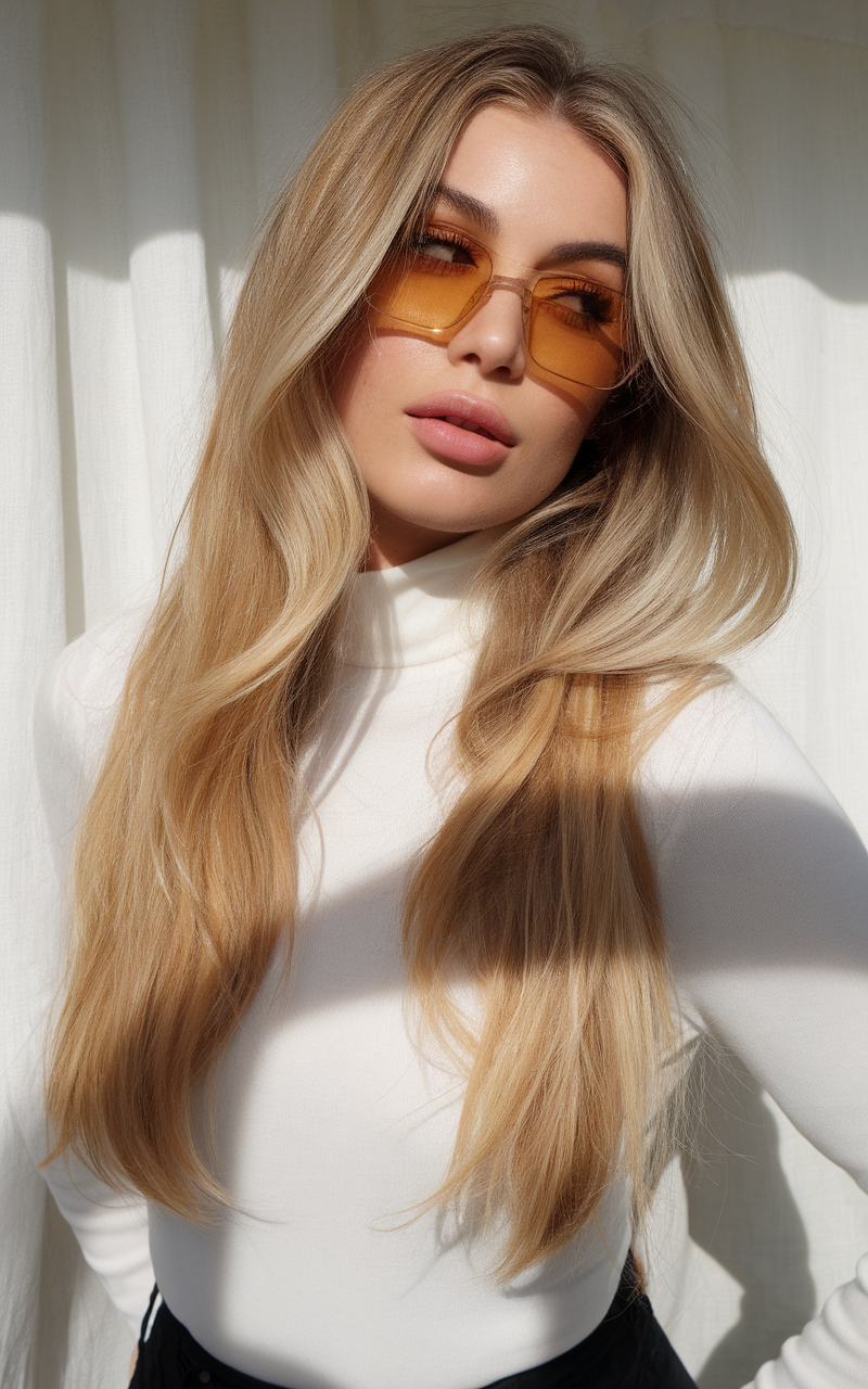 This long hair look is all about polished elegance, with sleek, feathered layers that frame the face beautifully. The soft middle part creates balance, making it perfect for those with an oval face shape. The warm blonde shade adds depth and shine, while the smooth texture gives a refined, effortless feel. A great choice for those looking for a sophisticated spring haircut with a modern twist.